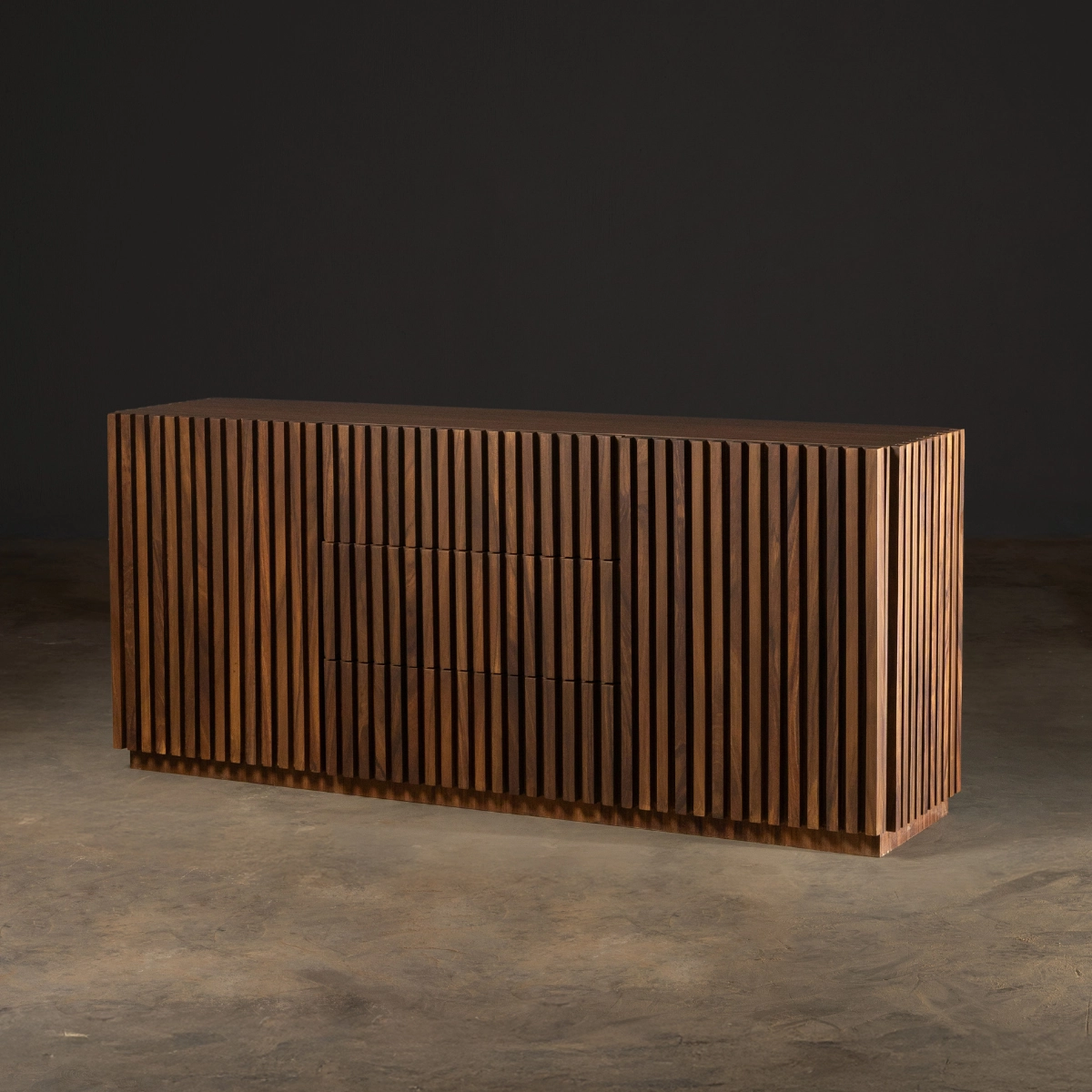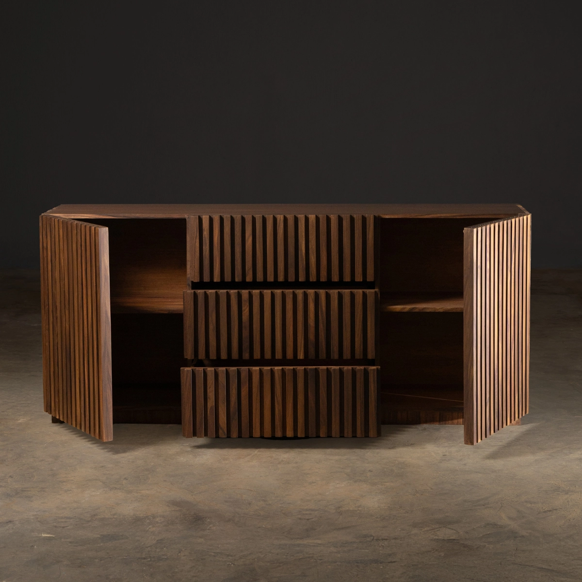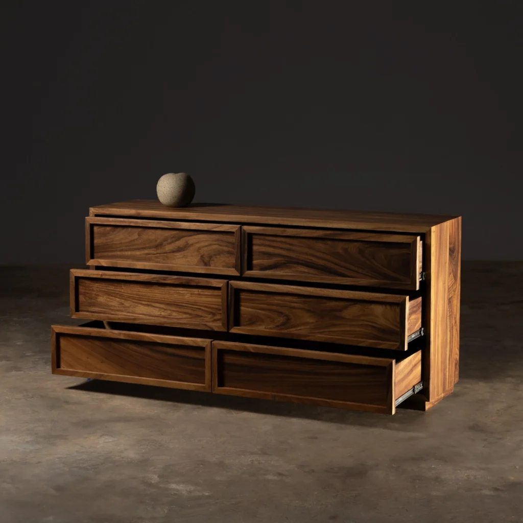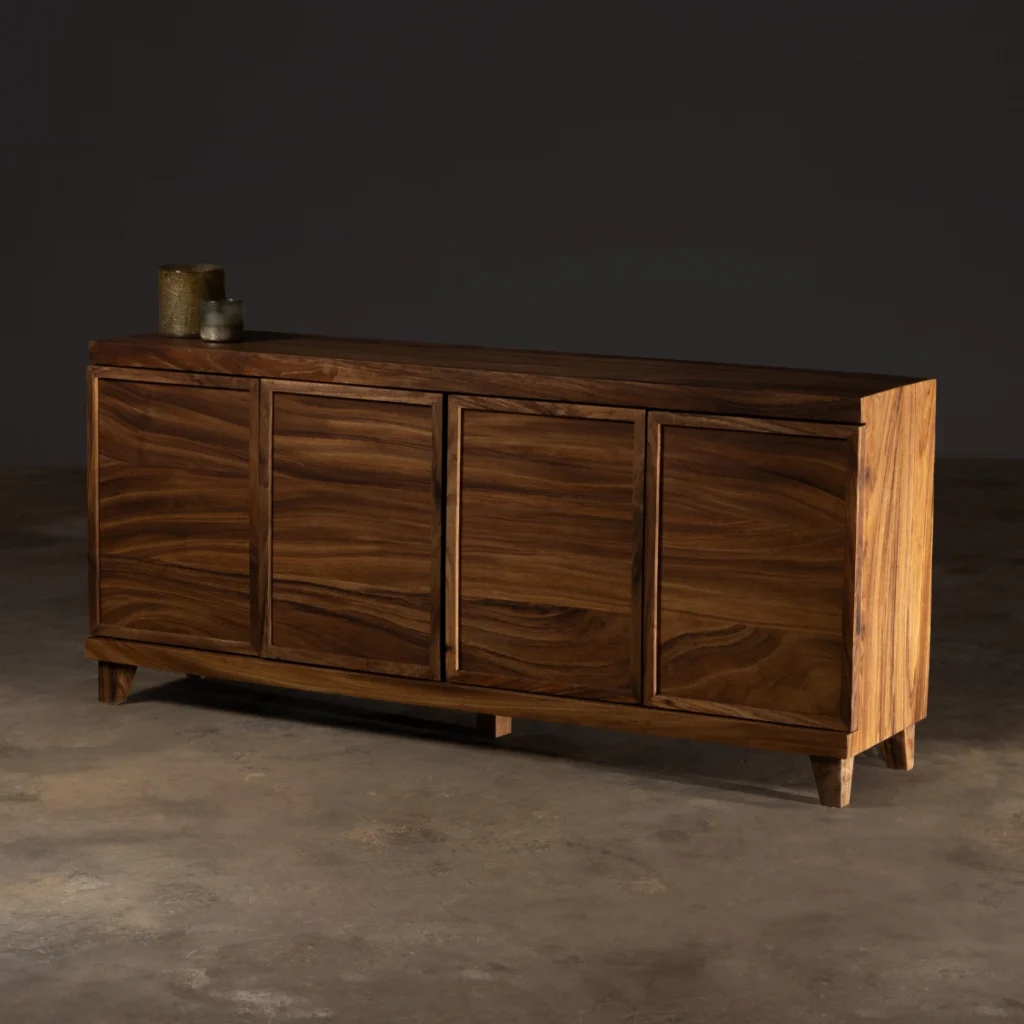 Mezcla arte y funcionalidad. Hecha en madera sólida, es una pieza que aporta almacenamiento y eleva cualquier ambiente.