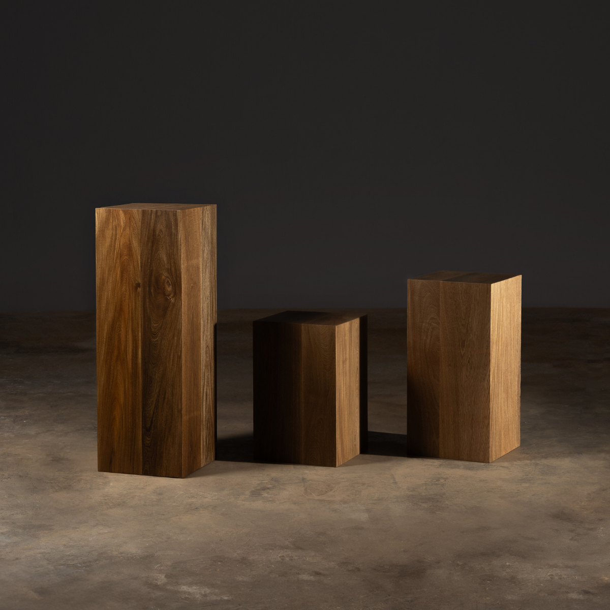 Escultura funcional en madera sólida que evoca equilibrio, fuerza y diseño.